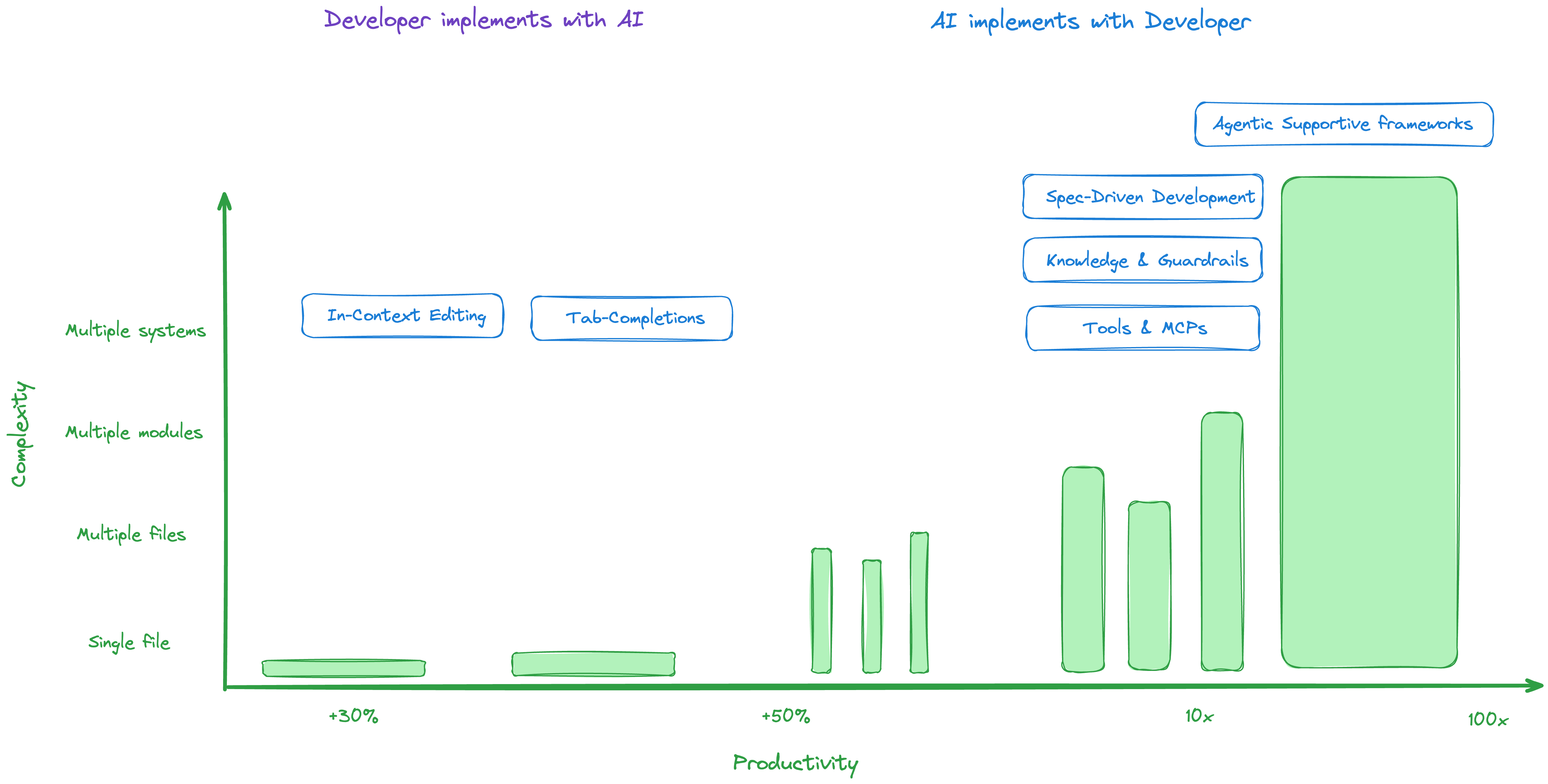 I used the earlier drawing made by Fabian Wesner and enriched his productivity chart with a new axis - complexity and draw a green blocks that visualize how agentic engineering concepts, from very basic to the most advanced with ASF are changing the productivity persistence while code base gets bigger. With ASF we build on the shoulders of agentic supportive modules, specs, guardrails, tools and MCP’s which promises the highest productivity boost possible with the current agentic engineering technology.