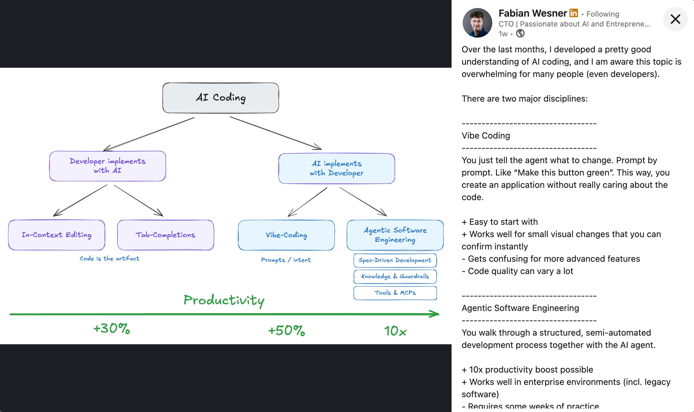 The pragmatist has to find a metric that can justify his bet on agentic engineering. The most important metric that technical leaders use to justify the investment in agentic software development is productivity boost. Fabian Wesner has recently visualized the productivity boost in agentic software development in a very clear and concise way.