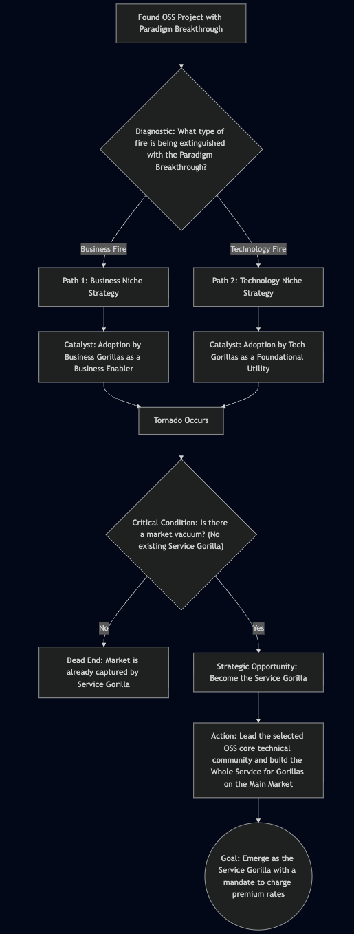 In business paradigm shifts, the OSS project addresses a strategic industry pain. Here, the signal must come from Business Gorillas — respected industry leaders (Heineken, Mitsubishi) who validate its business value. The path is slower — Bowling Alley strategy: niche by niche, building trust.