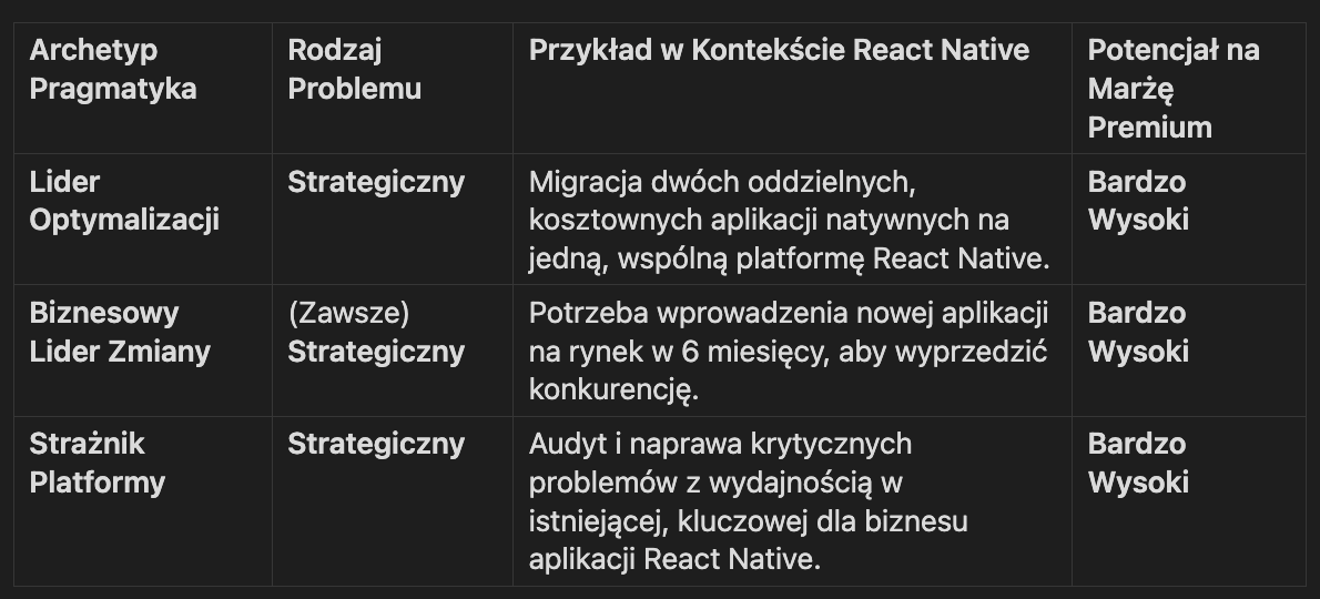 Strategia generalistyczna ("robimy aplikacje w React Native") jest skazana na porażkę i walkę cenową. Kluczem jest wybór przyczółka, który jest niedostatecznie obsługiwany przez obecnych liderów.