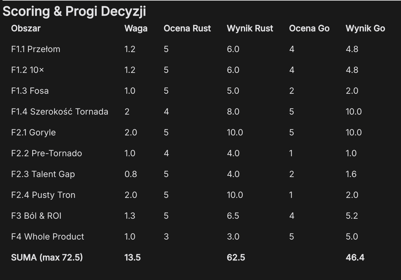 Rust: Rust ma przełom 5/5, 10× 5/5 i szerokość 4/5; rynek jest w fazie Pre-Tornado, tron usług jest pusty. W 90 dni: zbudować PoC migracji C++ dla FinTechu, pozyskać lighthouse w tej niszy, zbudować akcelerator Rust-Assured Migration™.