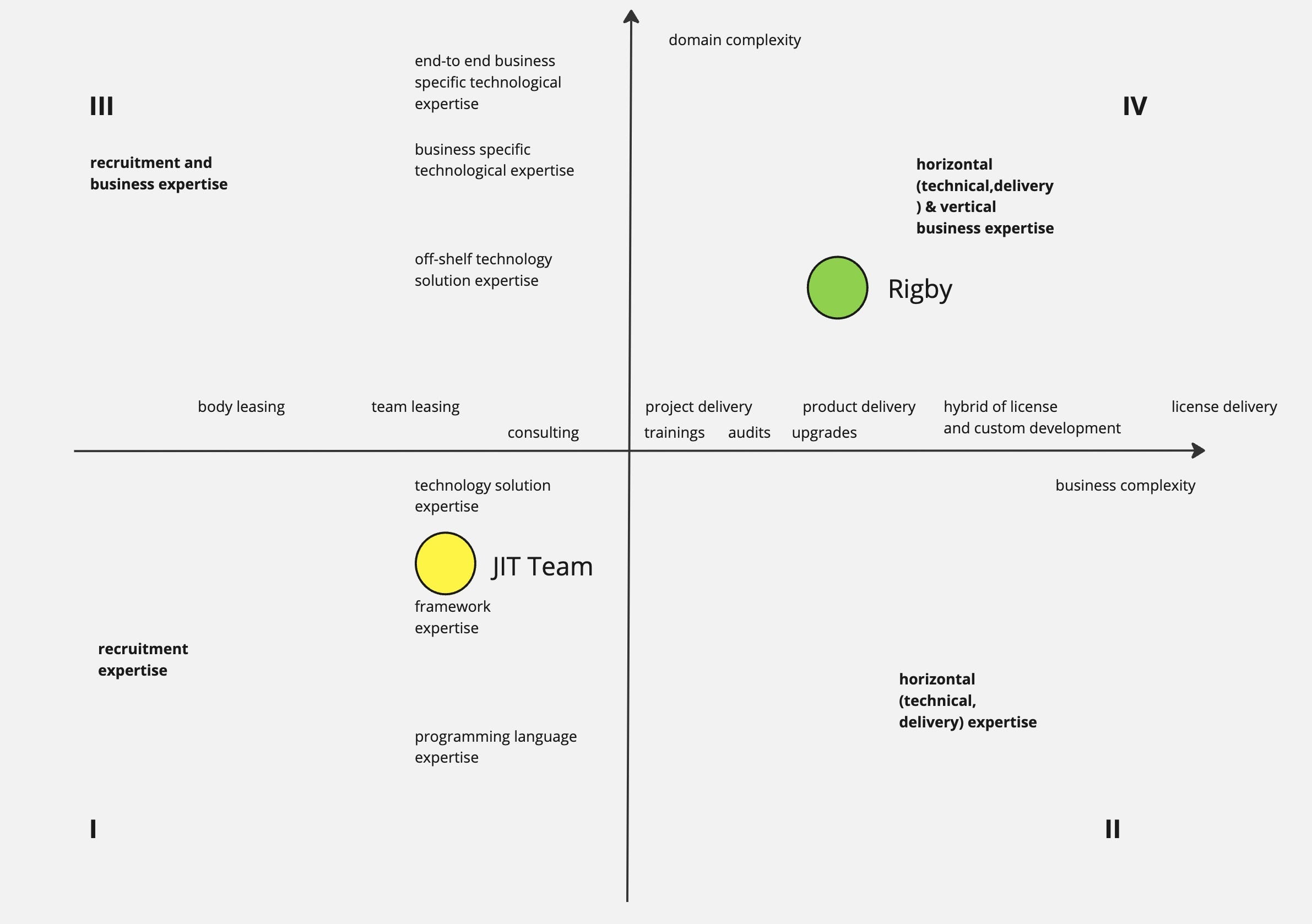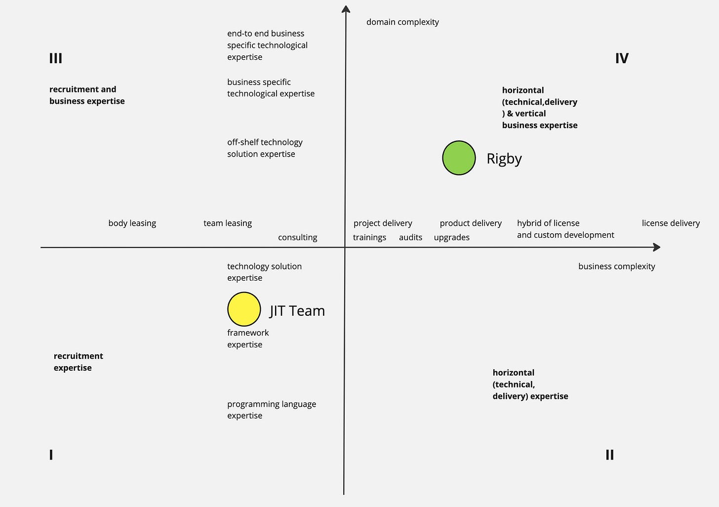 Na powyższym wykresie zaznaczyłem dwie firmy, o których pisałem w SHI#1. JIT Team oferuje usługi body/team leasing w określonych technologiach co plasuje ich w niskim poziomie złożoności procesu biznesowego. Rigby natomiast, wraz ze swoim OSS silnikiem wzrostu konkuruje z gotowymi rozwiązaniami “off-shelf” takimi jak Magento i próbuje sprzedawać bardziej zaawansowane usługi takie jak dostarczenie całego produktu/sklepu/marketplace dla klienta, sprzedaż rozwiązań na zasadzie subskrypcji czy abonamentu.