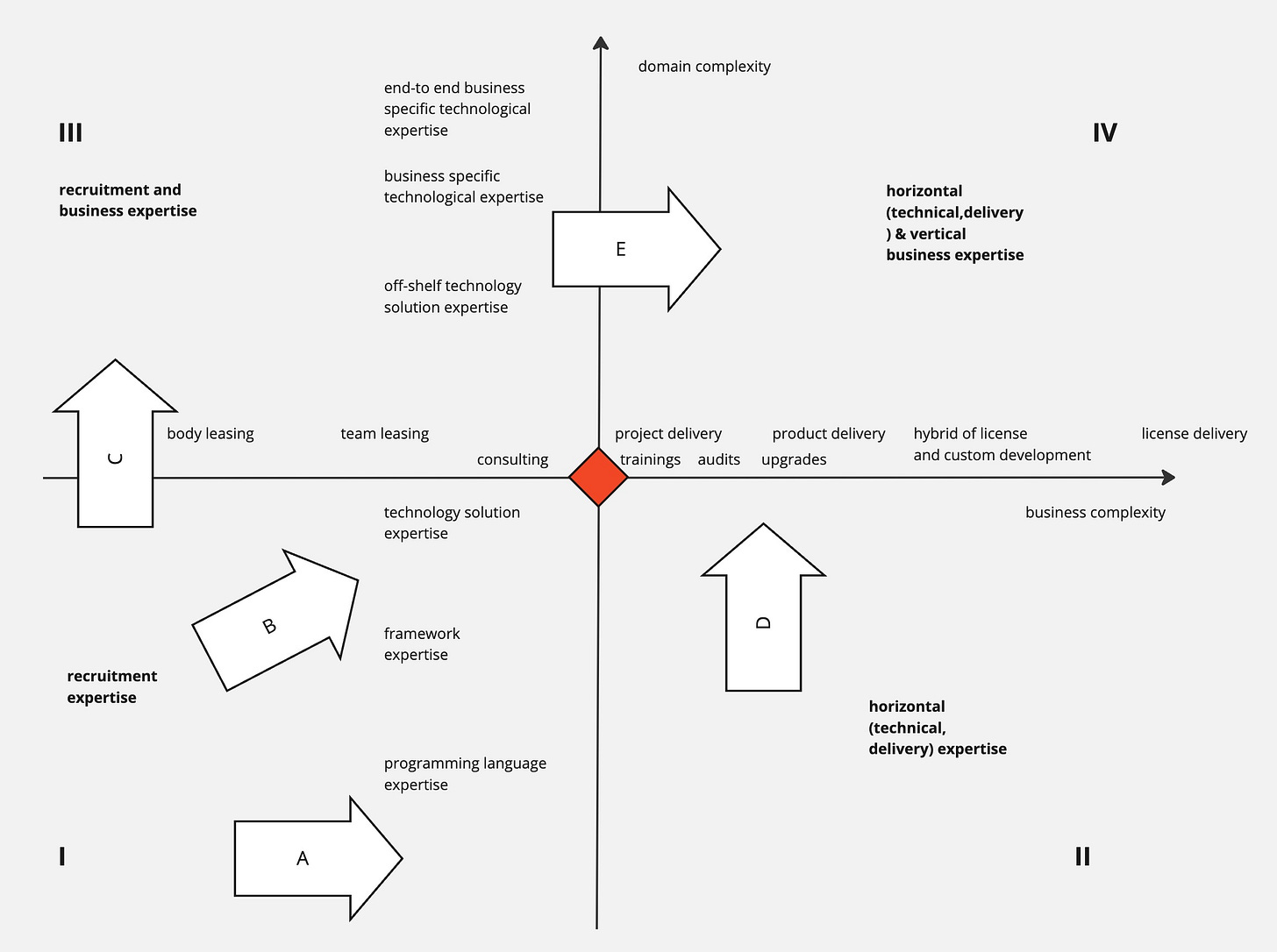 Ścieżka A to przejście z szeroko dostarczanego body-leasingu w różnych technologiach do dostarczania pełnych projektów, w tych technologiach. Im wyżej idziemy w osi X tym bardziej skupiamy się na wybranym zbiorze technologii. Swojego czasu tak działało Netguru, które zaczęło jako Ruby on Rails SH czyli mocno określony w niszy technologicznej SH, który skupił się na realizacji projektów MVP dla startupów i w ten sposób znalazł się w kwadrancie II. Co ciekawe, bycie w kwadrancie II często oznacza “nie wracamy” do kwadrantu I. Przykładowo, jeśli klient przyjdzie z prośbą “ja nie chcę całego zespołu, tylko 1-2 osoby na body-leasing” to będąc w kwadrancie II mówimy grzecznie, że to nie jest wartość i usługa, którą oferujemy i o ile klient jest faktycznie w potrzebnie dostarczenia całego projektu - staramy się go przekonać do naszego lepszego podejścia.